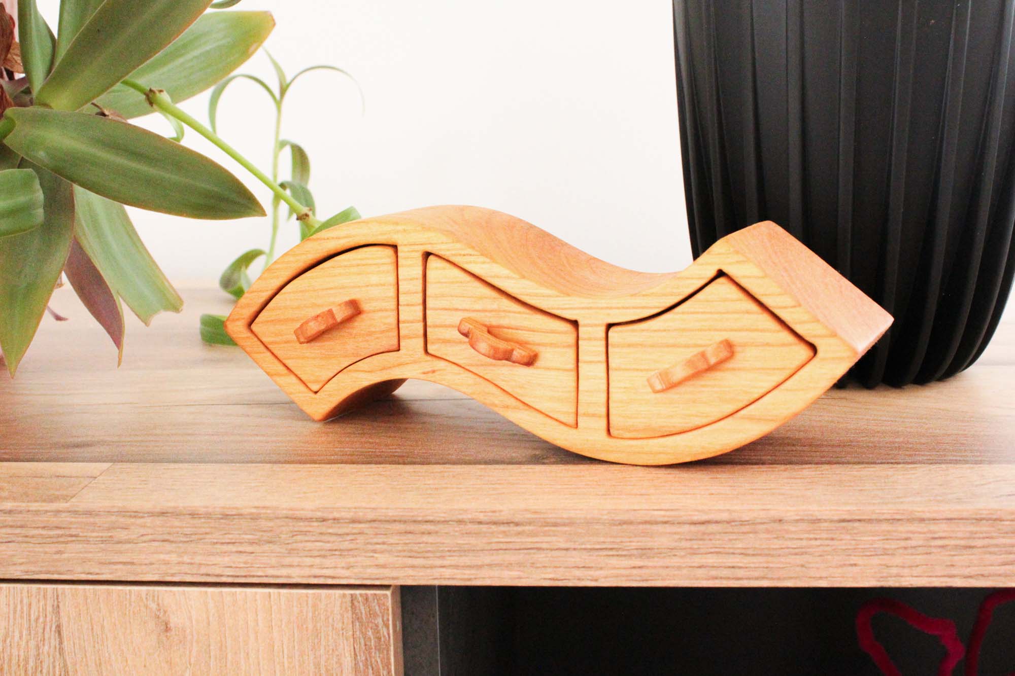 Szkatułka falowana z pewnością jest wyjątkowa. Posiada trzy szufladki, w których zmieści się dużo drobnej biżuterii. Dzięki niestandardowym kształtom jest to ciekawy dodatek do wnętrz.